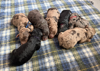 Please welcome Coco & Mr. Pickle's litter, the Patisserie! They were born November 6th, 2025. Go home ETA is the week of 12/27/2025. There are 4 females (gray, green, pink & purple collars) and 3 males (red, yellow & blue collars), varying in colors from Black with red Phantom, to merles with red Phantom.​​